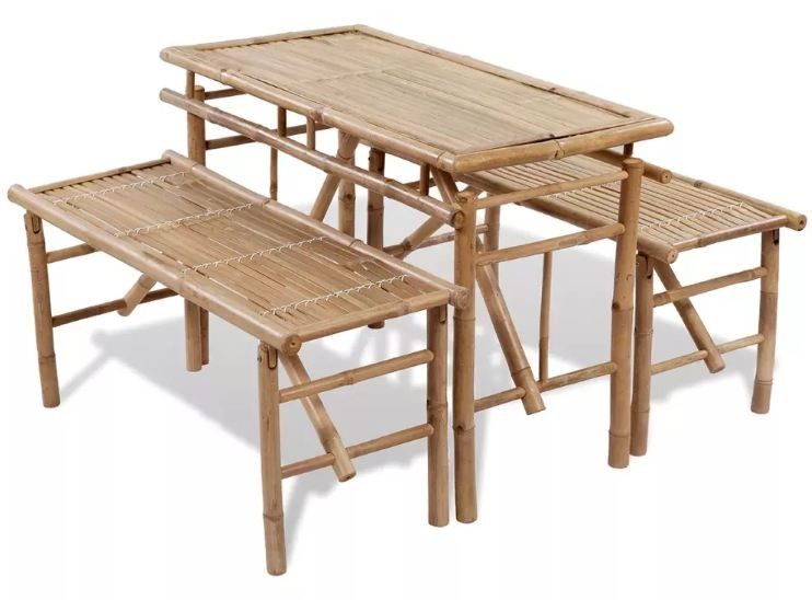 Cet ensemble de meuble de jardin en bambou apportera une touche tropicale à votre extérieur. Il est composé d'1 table rectangulaire pliable et 2 bancs pliables. Les meubles en bambou sont connus par leur résistance aux intempéries et à l'humidité.