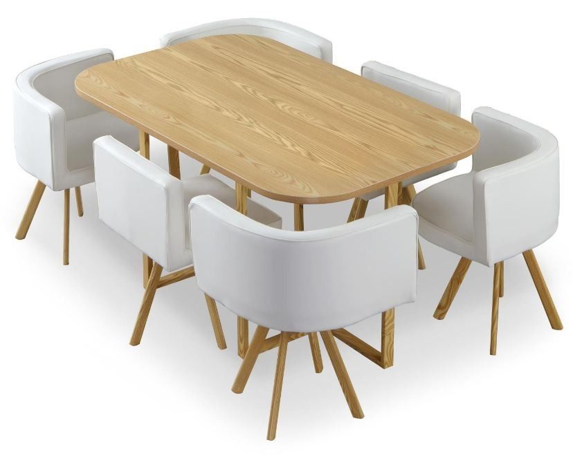 Table bois chêne clair et 6 chaises similicuir blanc Manda