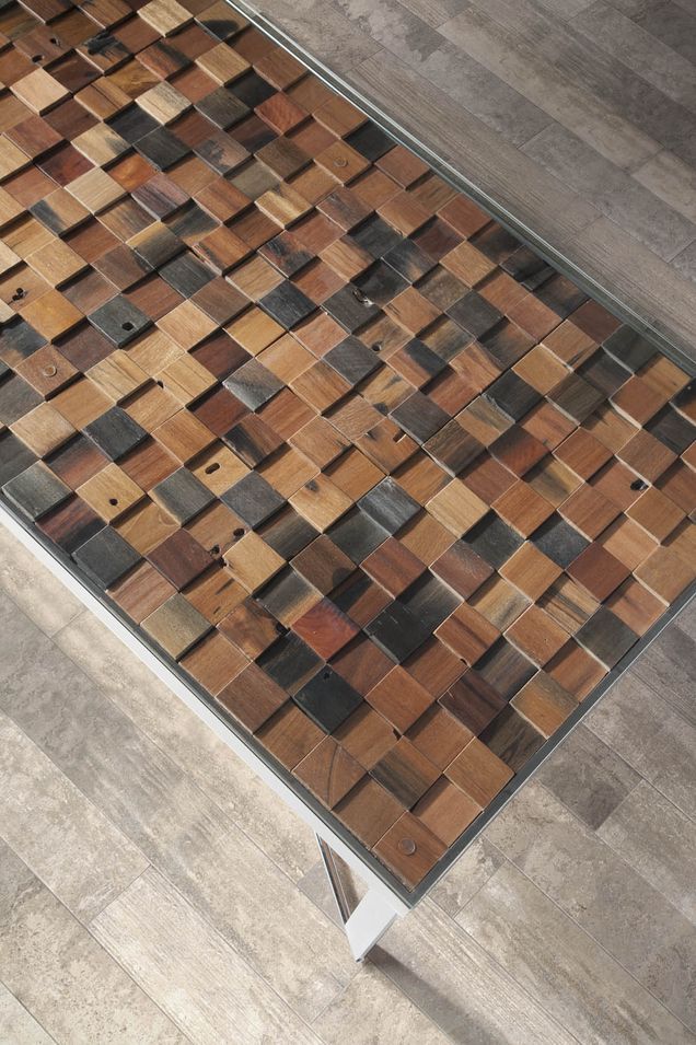 Cette magnifique table basse est fabriquée avec des morceaux de bois recyclés de style contemporain, ce qui la rend authentique. Sa partie supérieure en bois solide assure une surface stable et sécurisée par un plateau en verre trempé. Elle sera la touche parfaite pour souligner une note de déco originale.