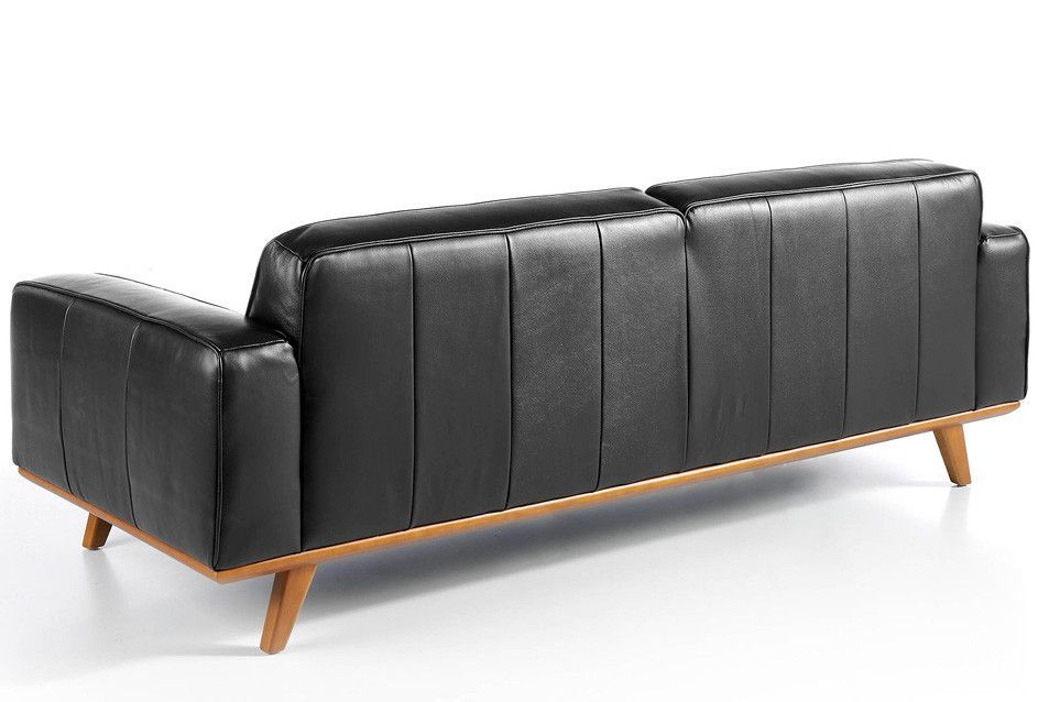Canapé KIRO – Cuir de vachette noir matelassé, pieds noyer