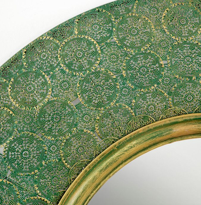 Ce miroir mural rond en métal doré et vert trouve sa place aussi bien dans une décoration contemporaine que dans un intérieur au style vintage chic. Placé au-dessus d’une console dans l’entrée, dans le salon ou dans une chambre, il apportera profondeur, luminosité et une touche raffinée à votre espace. -