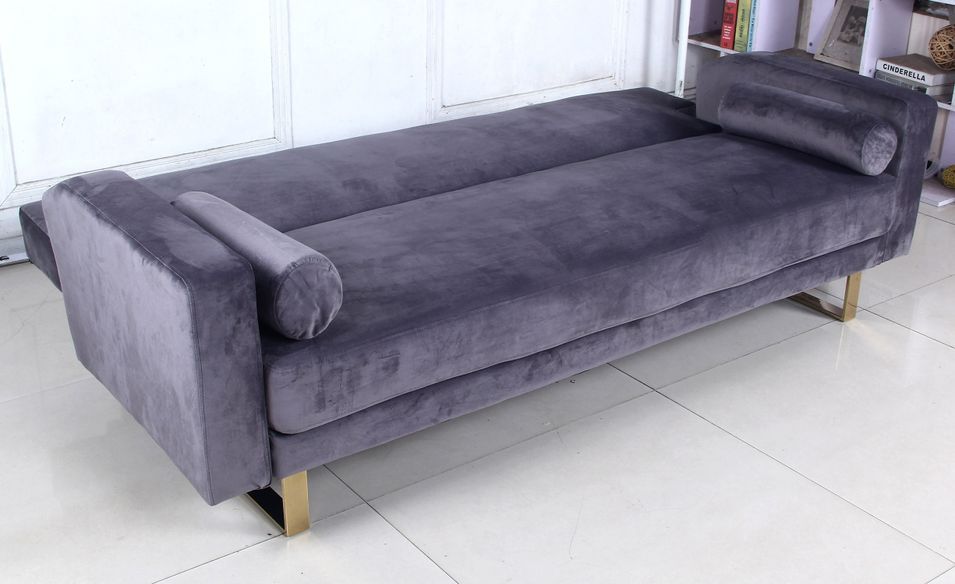 Canapé lit 3 places velours gris et pieds métal doré Lunna