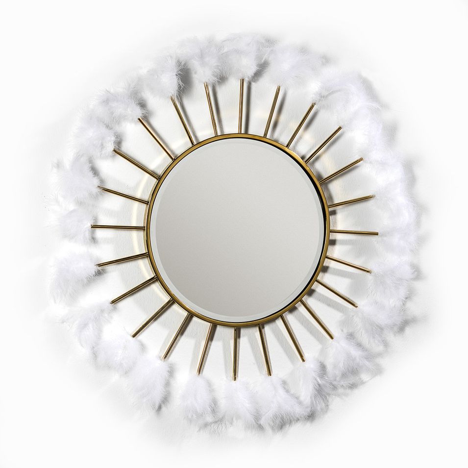 Miroir mural rond art déco métal doré et plumes blanches KITA - Ø 103 cm