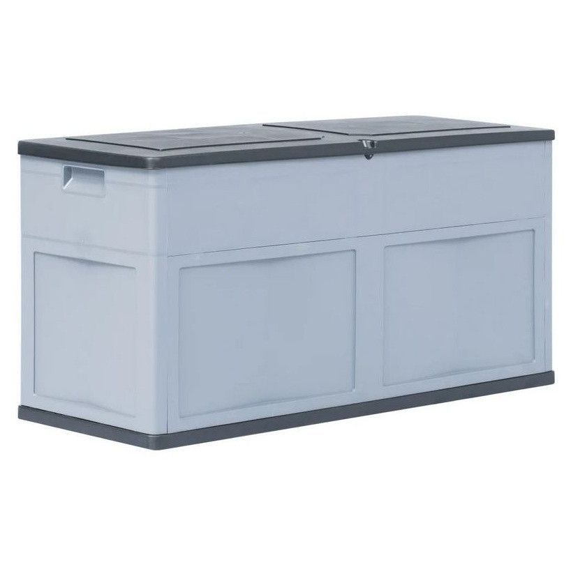 Pratique et contemporain, ce coffre est parfait pour ranger vos coussins de meuble, couvertures, jouets ou outils. Sa structure en plastique gris imitation bois est solide, durable et facile d'entretien.