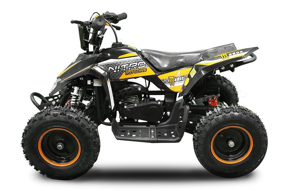 Le Quad enfant Madox 6 modele deluxe 49cc moteur 2 temps de couleur noir et bleu est doté d’une pédale de sécurité qui garantie un freinage en toute sécurité et dispose d'un châssis et un pare-buffle renforcés pour une conduite avec plus de confort !