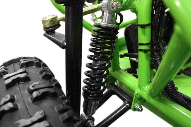 Ce buggy eco 450w de couleur vert pour enfant de 8 à 14 ans deux places avec ceinture de sécurité est léger et tout-terrain , il est monté sur un châssis en acier et des pneus cross 6 pouces. Il est équipé d'un moteur puissant et silencieux.