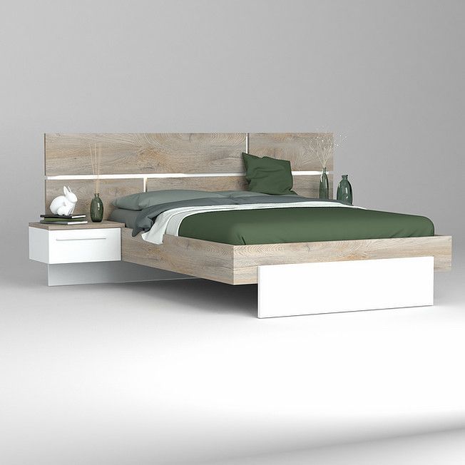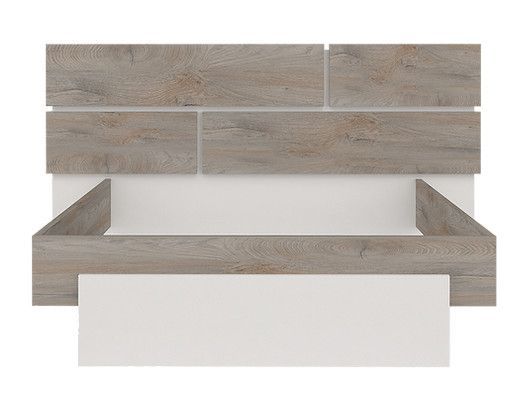 Lit laqué blanc et bois taupe grisé avec éclairage à tête de lit à effet graphique Kido 160x200 cm