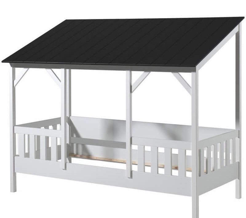 Lit cabane 90x200 cm avec matelas et sommier pin massif toit noir Mila