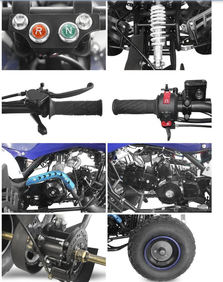 Le quad pour adolescent Speedy de couleur blanc et bleu 8 pouces semi automatique proposé avec une marche arrière est équipé d'un moteur 125cc (9CV), 4 temps monocylindre refroidi par air, d'un allumage CDI, d'une batterie12V 6,5Ah, de la transmission automatique par chaîne.