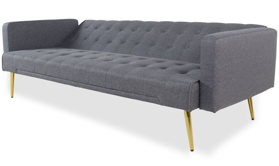 Design et élégant, ce canapé lit est à la fois pratique et esthétique, il sera parfait pour sublimer votre séjour. Il est fait en tissu gris foncé sur des pieds en métal doré, sa structure se convertit facilement en lit pour vous offrir un couchage d'appoint confortable.
