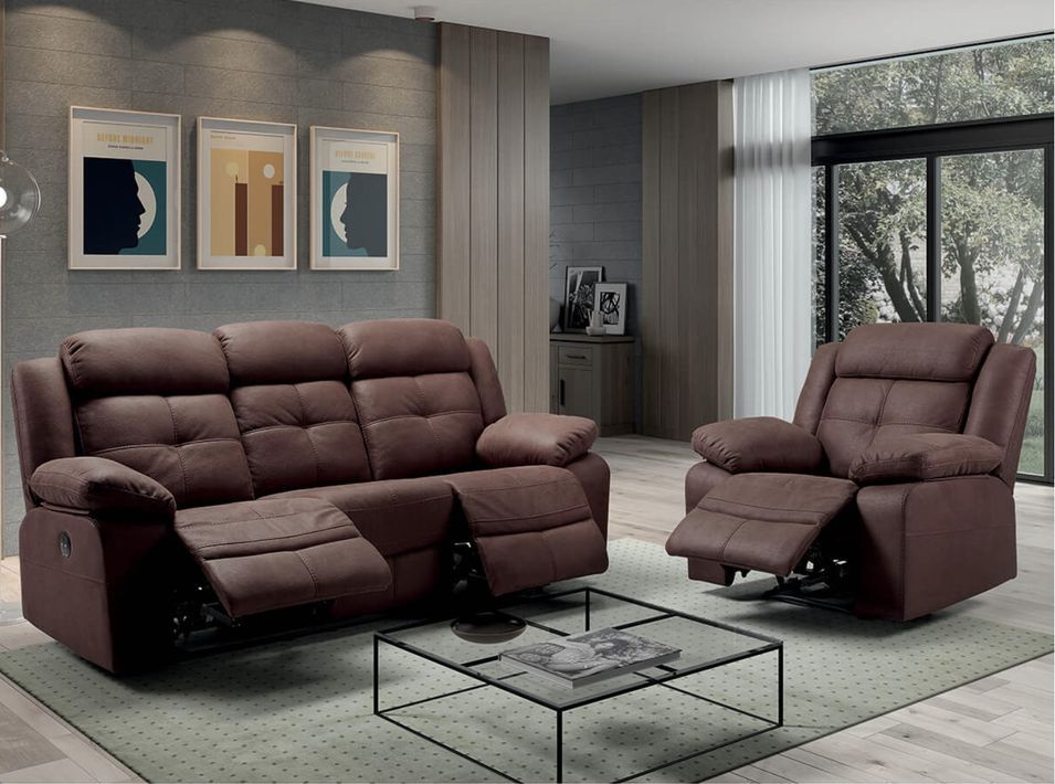 Fauteuil de relaxation modele 1 place version électrique avec un revêtement en nubuck de qualité de couleur marron de la collection Pinya.