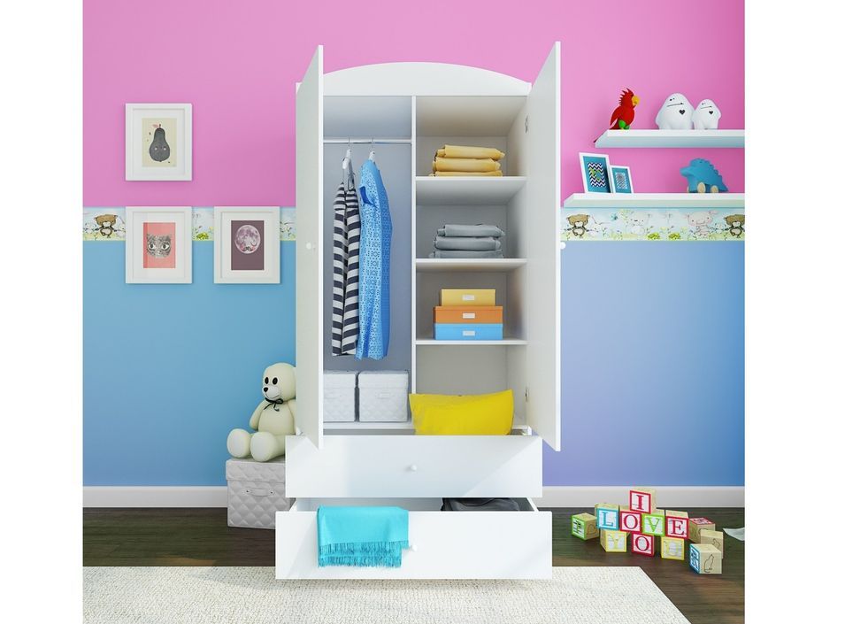 L'armoire pour enfant blanche petit éléphant dispose de 2 portes battantes 4 étagères (1/2 lingère) et 1/2 penderie et de 2 tiroirs spacieux de 50 cm de profondeur montés sur des guides à rouleaux qui permettent une utilisation facile.