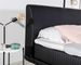 La tête de lit haute, unie et légèrement inclinée vers l'arrière contraste bien avec le matelas capitonné, tandis que les hautes pattes en bois ajoutent une touche d'élégance.