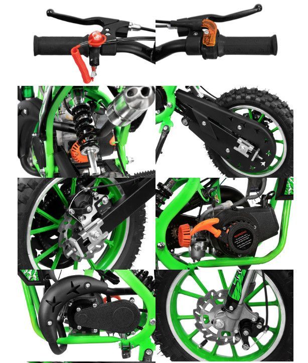 La dirt bike pour enfant Fossa 49cc de couleur rouge est équipée d'une suspension avant inversée, d'un démarreur à tirette et d'un système de bridage à 3 niveaux.
