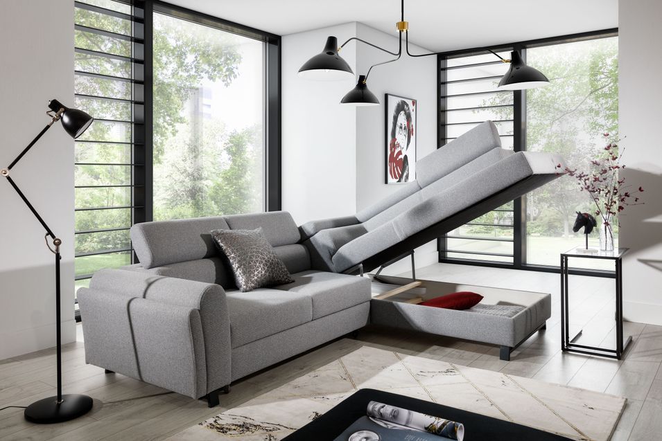 Le canapé-lit d'angle Nikos, ce dernier se dépliant facilement grâce au système d'extraction intuitif, offre un couchage de 125x192 cm. Il est parfait pour une bonne nuit de sommeil grâce aux matériaux de haute qualité. Le canapé dispose d'un rangement pour le linge de lit. Il économise de l'espace ailleurs dans la maison et aide à garder le salon dégagé.
