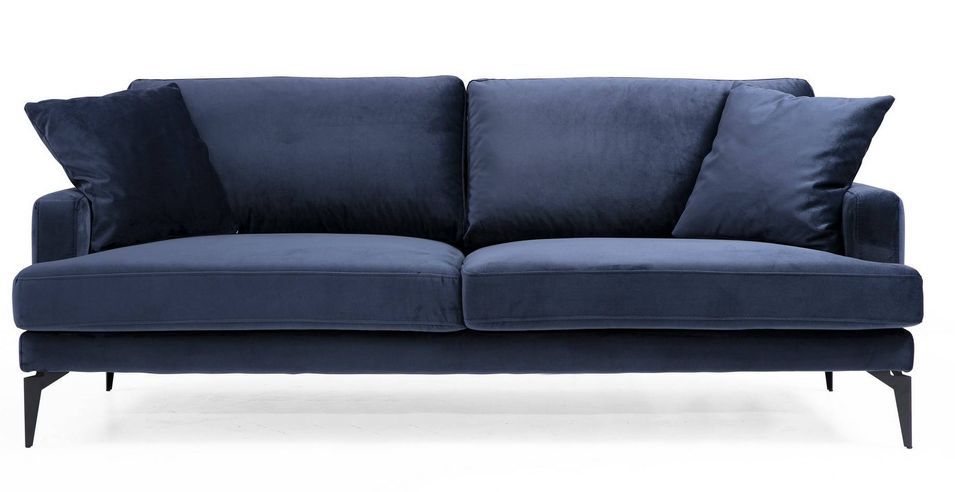 Ce sofa 3 places est réalisé en tissu bleu marine velouté doux et résistant. Il est proposé avec des pieds en métal noir et une assise profonde et moelleuse, ce qui en fait un canapé totalement dédié au confort.