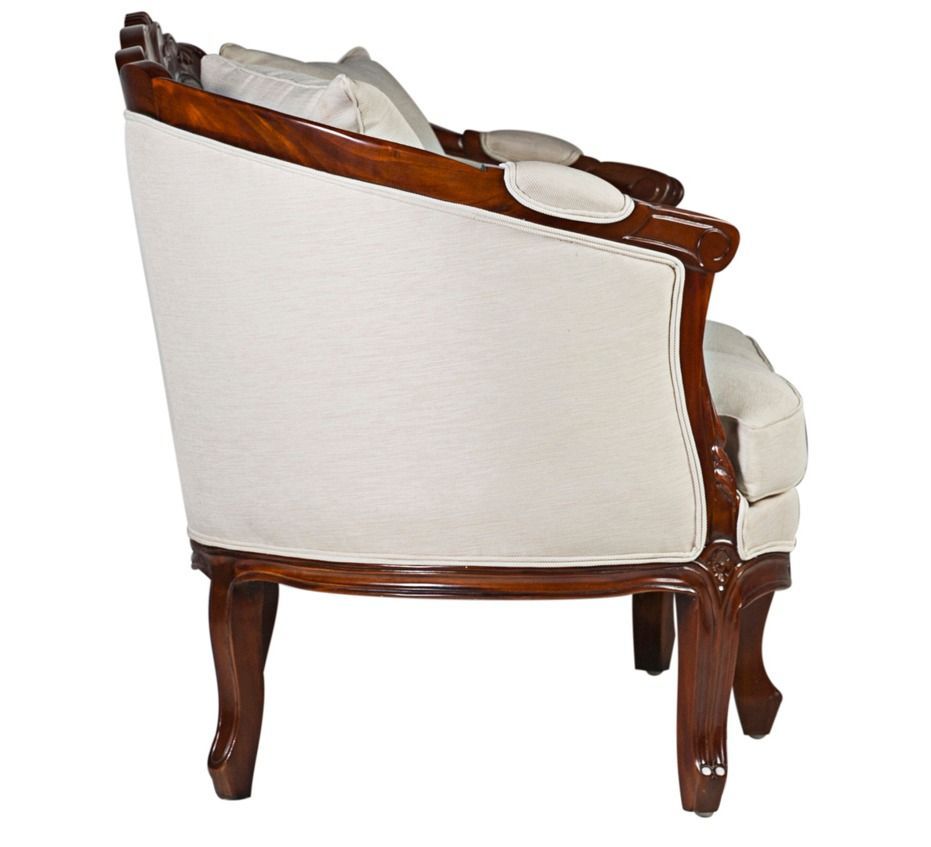 Bienvenue dans notre boutique de mobilier haut de gamme ! Nous sommes ravis de vous présenter notre dernier ajout à notre collection, le canapé en bois d'acajou marron avec une assise tissu beige.
