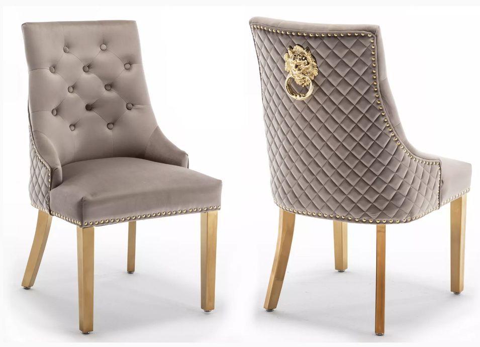 Chaise capitonnée velours avec anneau d'un lion au dos et pieds métal doré Elena - Lot de 2