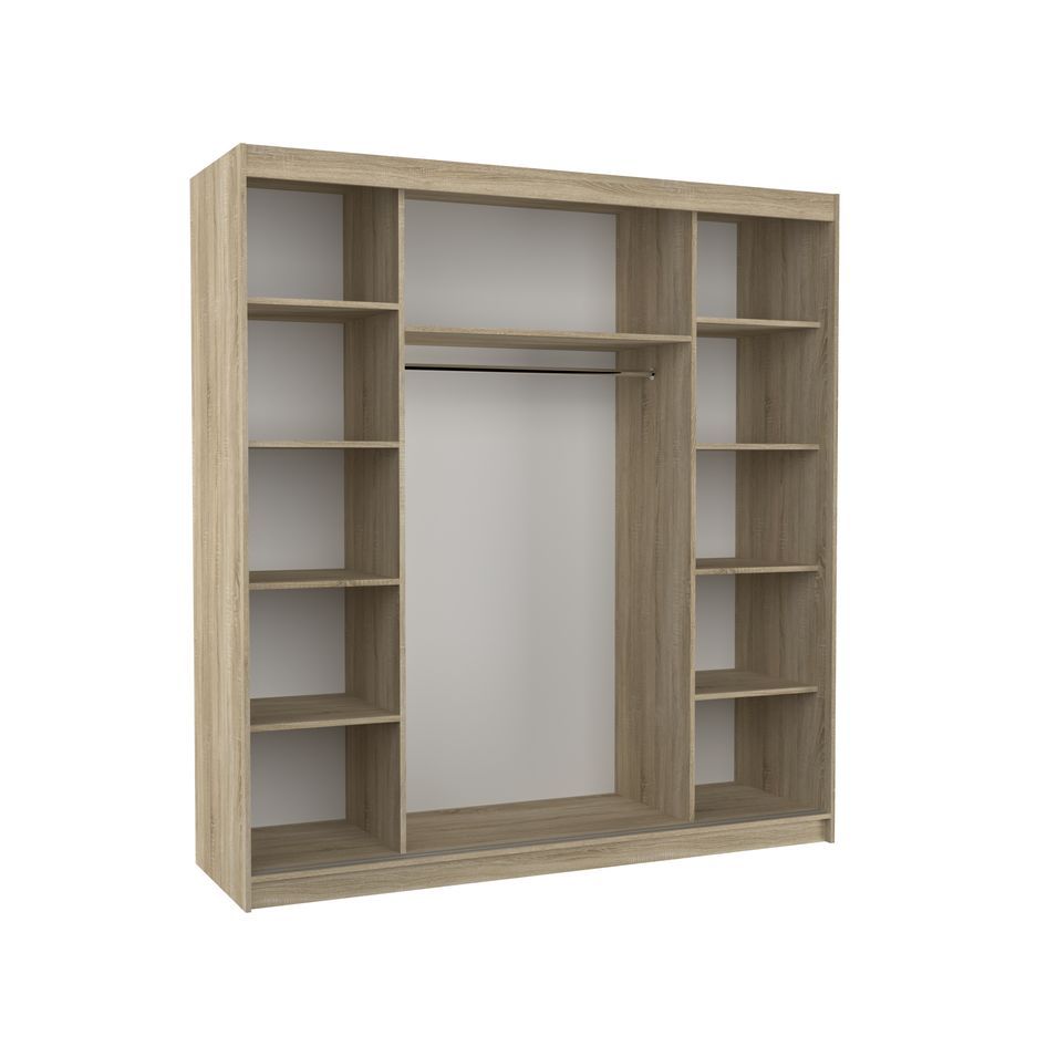 L'intérieur spacieux de l'armoire est équipé d'étagères généreuses, vous offrant amplement d'espace pour ranger vos robes, costumes, vêtements d'extérieur et chemises de manière organisée et accessible. De plus, un bar est prévu pour suspendre vos vêtements, les maintenant sans plis et prêts à être portés en toute occasion.