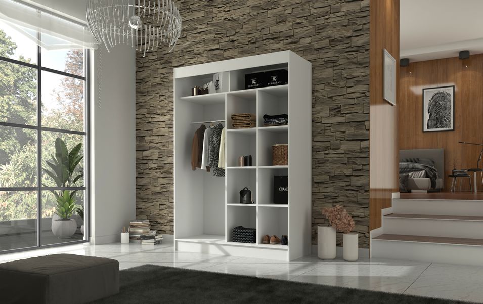 L'intérieur de nos armoires a été minutieusement conçu pour répondre à vos besoins de rangement. Des étagères réglables vous permettent d'adapter l'espace de rangement en fonction de vos besoins spécifiques, tandis que des compartiments pratiques avec penderie offrent un moyen pratique de suspendre vos vêtements. Que vous souhaitiez ranger vos chemises, pantalons, robes ou accessoires, cette armoire est conçue pour répondre à toutes vos exigences de rangement.