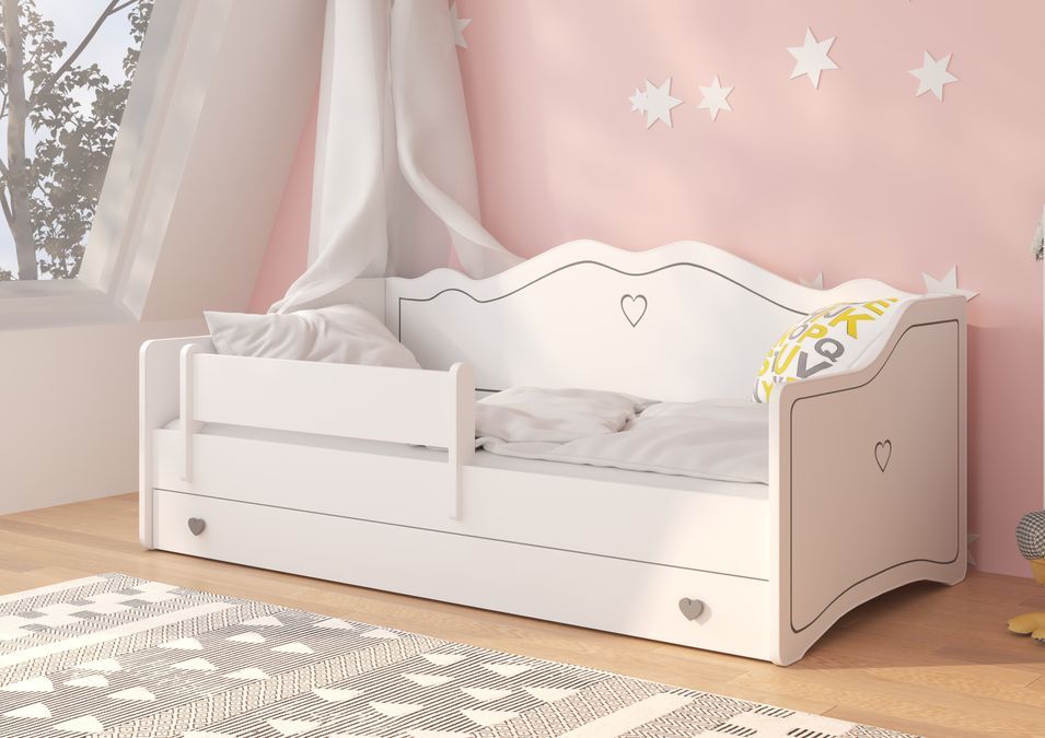 Découvrez le lit enfant en bois blanc vernis mat pour un couchage de 80x160 cm de la collection Kelly avec un tiroir de rangement sur roulettes et des petits coeurs gris !