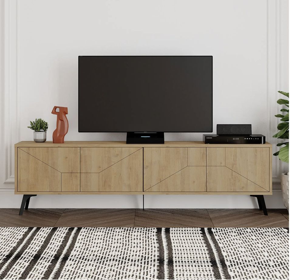 Meuble TV 4 portes bois clair motif géométrique Kuzako 180 cm