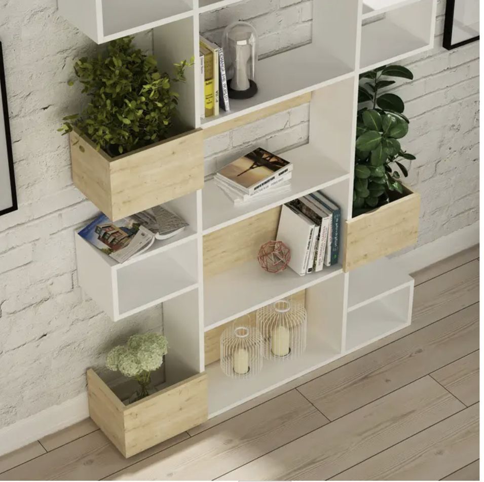 Matériau : Bois mélaminé blanc et chêne clair: Le matériau principal de cette étagère est du bois mélaminé, qui est un panneau de particules recouvert d'une couche de mélamine. Cela donne à l'étagère un aspect propre et moderne.