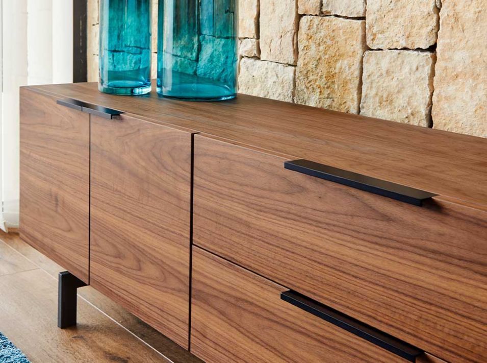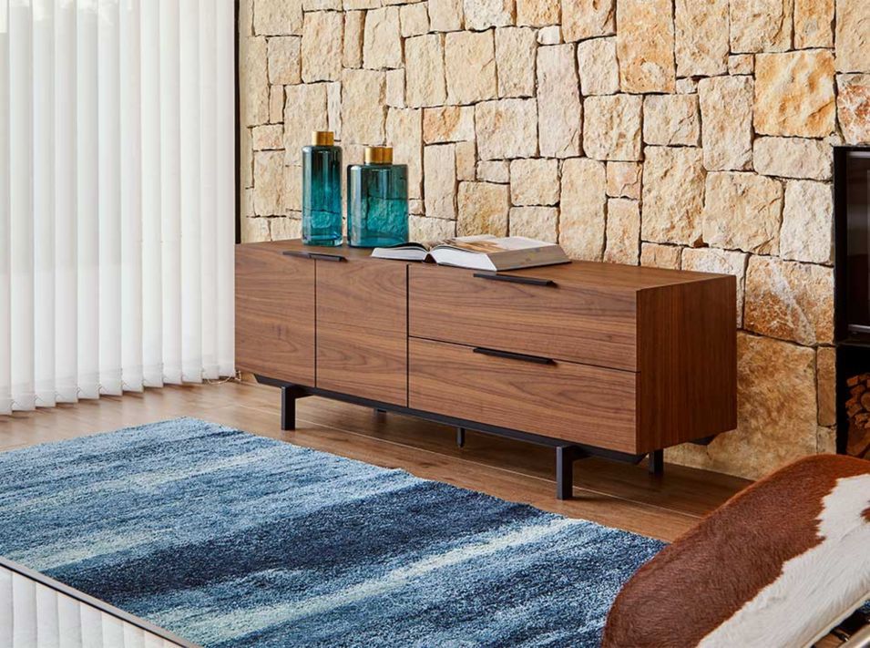 Meuble TV moderne 4 portes noyer et pieds acier noir kalia 165 cm