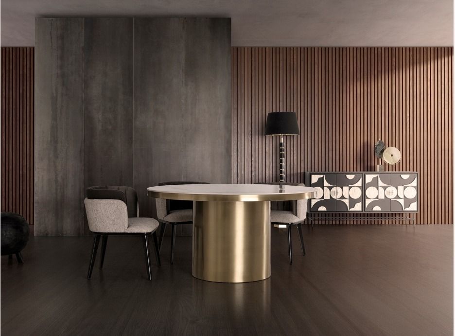 Table à manger ronde porcelaine et acier doré Tikah Ø150 cm