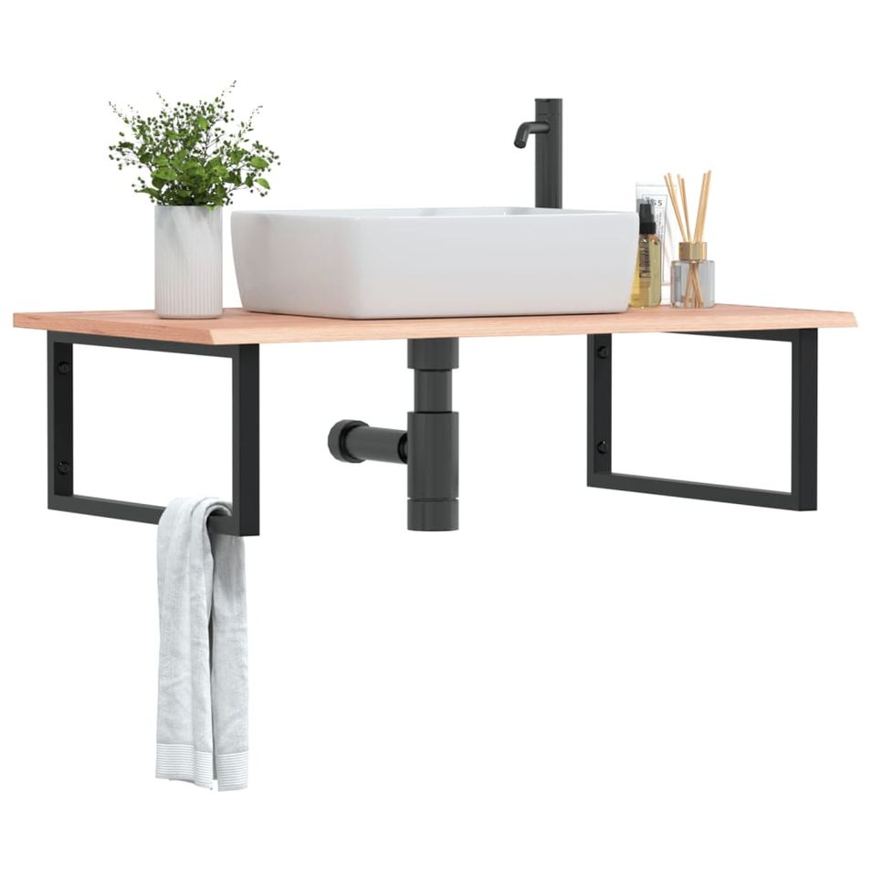 L'étagère murale pour vasque se fixe solidement au mur, offrant une solution élégante et peu encombrante pour votre salle de bains. Robuste et durable : cette étagère de lavabo est associée à une structure en acier et à un plateau en bois de chêne massif, ce qui la rend robuste, stable et durable.Gain de place : l’étagère flottante du lavabo offre suffisamment d’espace pour ranger les crèmes et les petits articles. Grâce à la forme rectangulaire, vous pouvez accrocher des serviettes ou d’autres choses sur le support pour gagner de la place.Facile à utiliser : le plan de travail n'est pas percé, ce qui permet d'installer la vasque à gauche, à droite ou au centre, selon les besoins de la pièce. Grâce aux trous pré-percés dans le support, il peut être facilement assemblé avec le plateau de table et fixé au mur.Multifonctionnel : grâce à son design moderne, il offre un espace supplémentaire pour différents types de salles de bains. Bon à savoir :Les vis ne sont pas incluses, vous pouvez les acheter séparément en fonction des informations fournies ci-dessous.Fixation murale : vis d'expansion M8 de 2 pcs par supportDessus en bois : vis M5x18 (T=2) de 2 pcs ou vis M5x20 (T=2,5/4cm) de 2 pcs par support.En tant que produit naturel, le bois peut présenter des nœuds et des imperfections que nous remplissons avec des garnitures noires pour garantir un aspect lisse.
