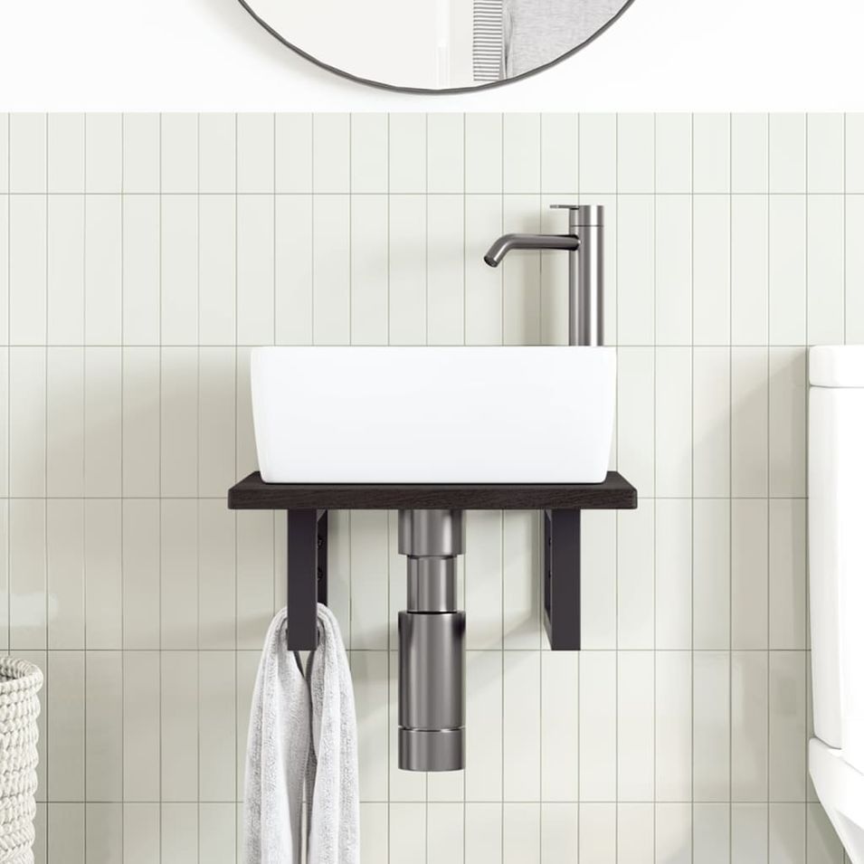 L'étagère murale pour vasque se fixe solidement au mur, offrant une solution élégante et peu encombrante pour votre salle de bains. Robuste et durable : cette étagère de lavabo est associée à une structure en acier et à un plateau en bois de chêne massif, ce qui la rend robuste, stable et durable.Gain de place : l’étagère flottante du lavabo offre suffisamment d’espace pour ranger les crèmes et les petits articles. Grâce à la forme rectangulaire, vous pouvez accrocher des serviettes ou d’autres choses sur le support pour gagner de la place.Facile à utiliser : le plan de travail n'est pas percé, ce qui permet d'installer la vasque à gauche, à droite ou au centre, selon les besoins de la pièce. Grâce aux trous pré-percés dans le support, il peut être facilement assemblé avec le plateau de table et fixé au mur.Multifonctionnel : grâce à son design moderne, il offre un espace supplémentaire pour différents types de salles de bains. Bon à savoir :Les vis ne sont pas incluses, vous pouvez les acheter séparément en fonction des informations fournies ci-dessous.Fixation murale : vis d'expansion M8 de 2 pcs par supportDessus en bois : vis M5x18 (T=2) de 2 pcs ou vis M5x20 (T=2,5/4cm) de 2 pcs par support.En tant que produit naturel, le bois peut présenter des nœuds et des imperfections que nous remplissons avec des garnitures noires pour garantir un aspect lisse.