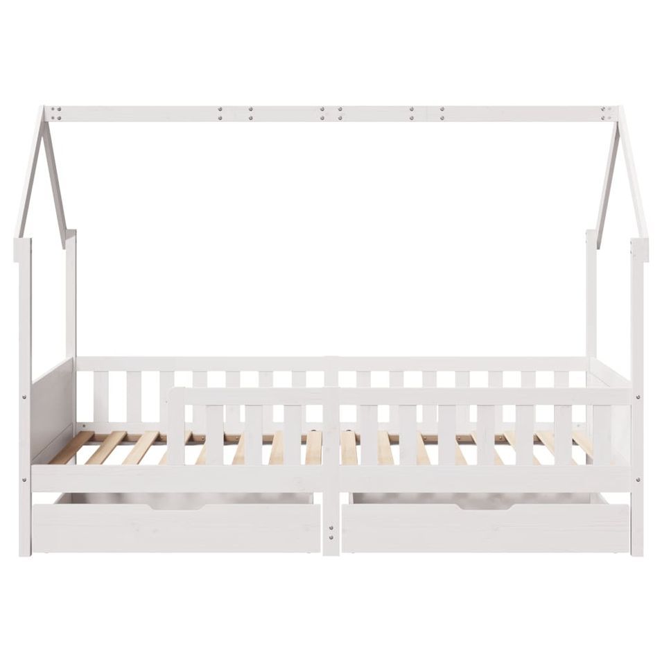 Votre enfant adorera ce fantastique cadre de lit pour enfants en forme de maison en bois, qu'il rêve de sa prochaine aventure ou qu'il soit en train de s'endormir. Cadre stable et durable : le bois de pin massif est connu pour sa résistance et sa durabilité. Ses grains droits et ses nœuds distinctifs contribuent à son charme rustique.Modèle en forme de maison ludique : ce cadre de lit ludique inspiré en forme de maison transforme l'heure du coucher en une aventure fantaisiste pour les enfants. Il offre un endroit confortable pour le coucher et un espace ludique pour les jeux d'imagination.Barrières pour une sécurité accrue : ce cadre de lit est équipé de barrières latérales pour éviter que votre enfant ne tombe du lit pendant son sommeil.Structure de toit ouverte pour bricolage : la structure du toit ouvert offre des possibilités de créations infinies, vous permettant d'accrocher facilement des décorations ou d'attacher une tente de jeu pour créer un espace vraiment magique et personnalisé.Rangement spacieux sous le lit : ce cadre de lit est conçu avec un grand espace sous le lit pour ranger des boîtes, des paniers, des tiroirs et bien plus encore.Manœuvrabilité sans effort : ce tiroir de rangement sous le lit est équipé de quatre roulettes, ce qui permet une manœuvre en douceur et sans effort pour le faire glisser sous le lit. Bon à savoir :Un matelas n'est pas inclus avec ce lit. Nous offrons une sélection variée de matelas. Vous pouvez consulter notre boutique pour trouver un matelas assorti.