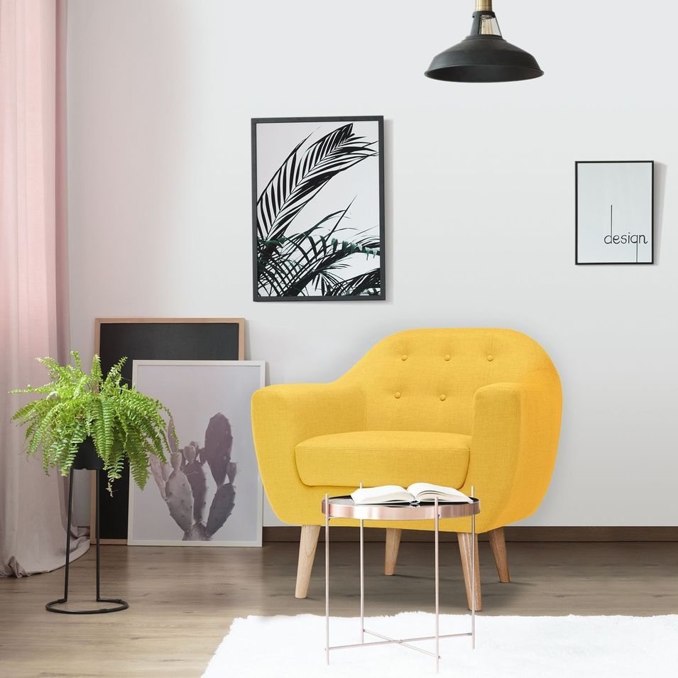 Revêtu de tissu jaune de qualité et monté sur des pieds en bois massif, ce fauteuil embellira sûrement votre intérieur. Sa conception robuste et son revêtement doux vous offre un grand confort d'assise.