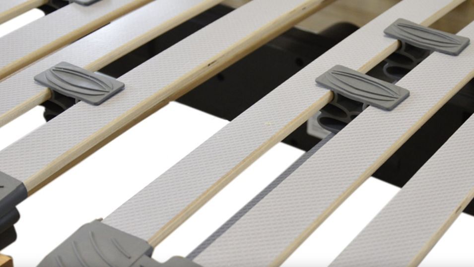 Lattes : 31 lattes en bois de bouleau plaqué avec une finition grise, dont 3 lattes renforcées pour le soutien lombaire, réglables avec curseurs de fermeté.