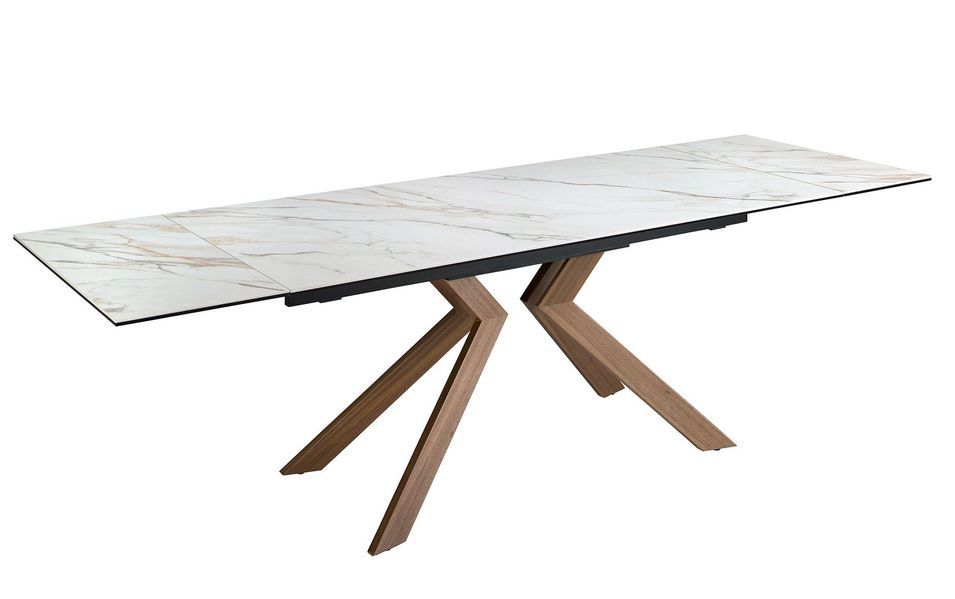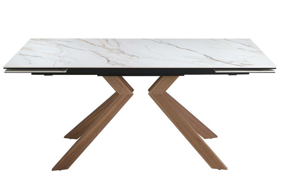 Avec cette table à rallonge rectangulaire en marbre porcelaine et acier effet noyer, combinez style, confort et praticité dans votre intérieur. Une pièce idéale pour ceux qui cherchent à allier design moderne et fonctionnalité. -