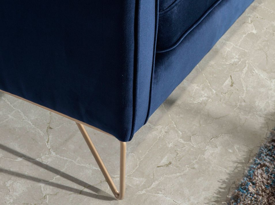 Canapé 2 places effet velours bleu et pieds métal doré Arkane